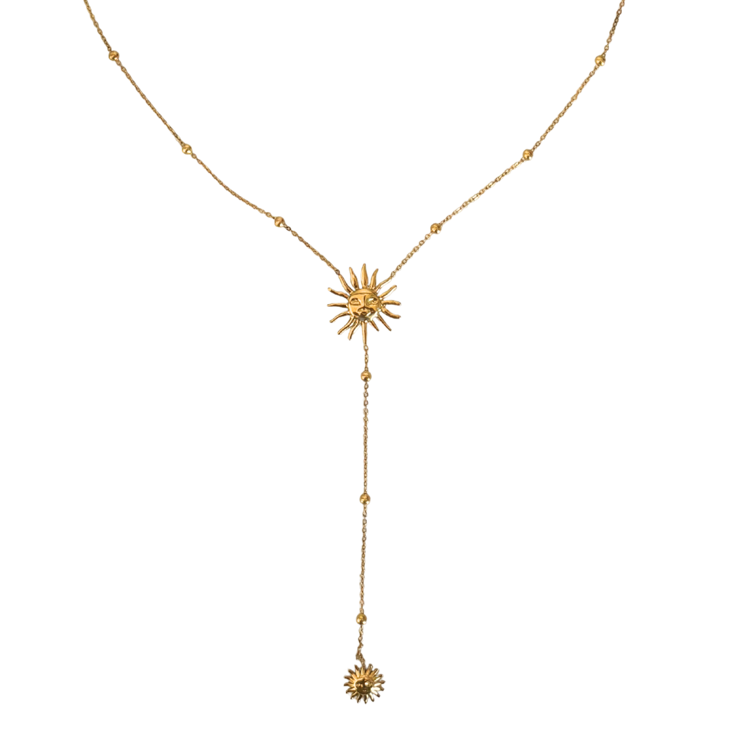 Where the sun meets the sea. The Solar Drop Necklace captures golden light in motion — radiant, fluid, and endlessly captivating. Its double sun design symbolizes connection: one sun above, one below, forever linked by light. Wear it when you want to feel like the main character (under any sky).