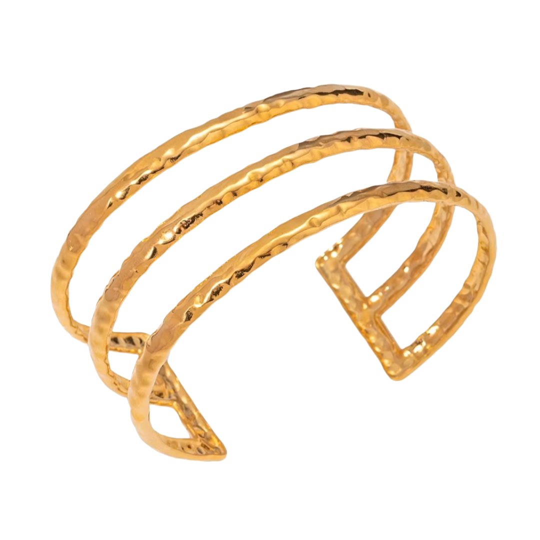 Three bands, one energy. The Trinity Bracelet symbolizes balance — mind, body, and spirit moving in harmony. Its hammered texture catches the light with every gesture, like ripples on golden water. Bold, radiant, and grounding all at once.